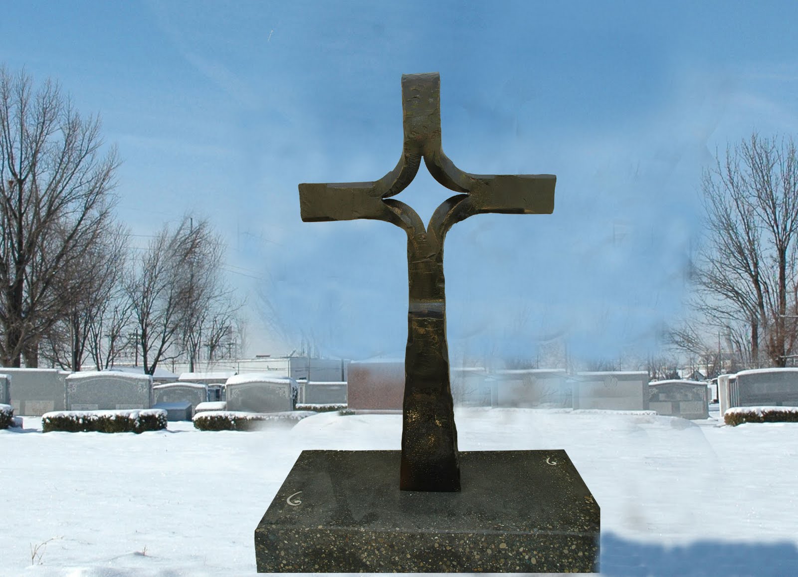 The remaining pieces are of a range and contrast to further illustrate how the exhibit presents both the traditional and the unconventional in ways that explode as well as reaffirm the idea of funereal monuments, from Guy Tedesco’s beautifully rendered bust,”Saint Francis” that is exacting in its detail, to David Kocka’s series of small figures, such as “Virgin with Arms Outstretched”, that are gestural, three dimensional sketches of human form and movement.
