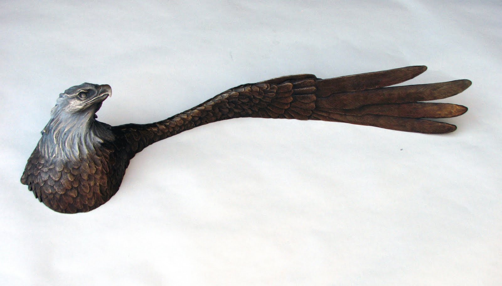 Matt Weir’s “Eagle” is a fragment of a larger sculpture that, as we see in an adjacent photograph, is a full-scale representation of an American Bald Eagle that registers all the splendor and majesty we might expect from the iconic bird. But the piece we see is of the head shoulders and one wing, mounted on a wall. There is a frightful tension that results from what is at this point a relief sculpture, as the bird seems to struggle to extricate itself from the wall, a creature caught between dimensions. The realistic sculpture suddenly becomes almost surrealistic in its impact.