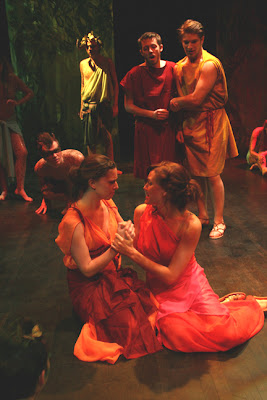 My hat goes off to director Julane Havens for her lyrically infused blocking. In most Shakespearean comedies, scenes placed in wooded pastoral areas refer to themes of fertility. Havens focuses her production on the fertile wood and intricately uses her band of fairies (Victoria Reibel, Lauren Maxwell, Melinda Beck, Sabrina Spaulding and Jennifer Thompson) with Puck (Clay Marshall) as the captain of the mischievous, flirtatious crew. Havens transforms her fairies into sexual beings whose powerful presence dictate the shenanigans that the mortal lovers and fumbling troupe of actors encounter. As the mortal characters run amuck in the woods under the various spells, Havens takes the opportunity to have her fairies constantly present in assorted poses representing trees, rocks and other natural elements. This was a clever way to use the fairy cast as well as save money on set pieces. I wanted to see this concept used more throughout the entire production. As the mechanicals perform their play-within-the-play, Havens brings her fairies back on stage to watch the performance. Except for a comedic bit between Marshall and Tom Schulz, who plays Snug, a stage frightened actor, the choice to have fairies present could have been reconsidered.