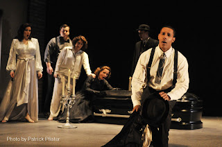 Still, some of the casting calls to mind film noir mainstays: Ben Wager’s Don Giovanni has the slick, oily presence of Joseph Calleia in The Glass Key, while Deborah Selig cuts an Ava Gardner-like figure (The Killers) when she makes her entrance as Donna Elvira in a stunning white period suit. Yet for the most part the performers make an impact based on their merits as singers rather than any resemblance to Hollywood stars from a by-gone era. Donovan Singletary was the highlight of the evening as Leporello, Don Giovanni’s aide, in a well-measured comic performance that easily ingratiated the character to the audience. Katy Lindhart was another standout as Zerlina, delivering great sass and wit to the main love story with Masetto, played by an able Noel Boulley.
