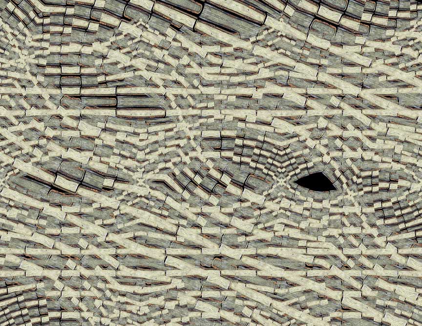 Mr. Auerbach’s previous bodies of work were much more abstract and characterized by vivid color and organic shapes. Now he has reintroduced representational elements and, for the most part, restricted his color palette to a mostly monochromatic and analogous range of warm, natural tones that echo the aged patina of the pages. A few of the pieces share some of the amorphous shapes of the previous generation of digital abstracts, but the strongest work here takes a different direction. Instead of a riot of splattered, organic forms, the compositions are constructed from severely geometric shapes and repetitive structures. These range from the simple and elegant spirals of kinetic angles that result in the leg-like shapes of “Gut Dance,” to the almost overwhelmingly dense texture of “Gutenberg Book.” The latter image consists of scans of each end of the fragile volume – two similar but distinct visual components that are repeated in a format so tight that it creates visual layers of form and texture, fashioning an abstraction from the representational.