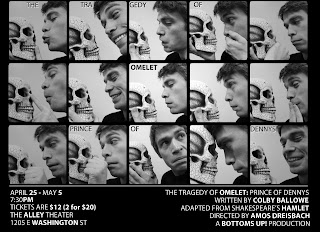 When I first read the title of this show, I thought for sure that it would be a parody of Hamlet set in a Denny’s restaurant. I’m guessing I wasn’t alone in that assumption. The Tragedy of Omelet Prince of Denny’s went up at the Alley the other night and is the final play of the season for Bottoms Up! Productions. The play, in fact, has nothing to do with omelets or diner chains of any kind: it’s pretty much Hamlet with some modern slang thrown in just for fun. That leaves The Tragedy of Omelet somewhere along the spectrum of a full-on parody, and an actual modern translation. I wish the author had gone one way or the other, because right now the play feels like it’s in that squishy place between wanting to be a parody and also wanting to revere the text it is mocking.