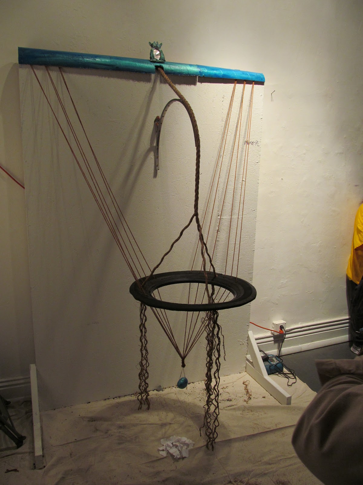 Each one of eight artists contributes an element into the mix, and then they are tasked with making an installation with those ingredients in sixty minutes with a crowd watching. The individual artist works on his or her own to create from scratch with materials presented only moments before. The materials in this instance included one potato, a length of hemp rope, a ball of rust-brown yarn, a 4′ length of heavy cardboard tubing, a metal wheel rim, a section of tire, some 8″ x 11″ paper, and a small curio frame. At the end, viewers vote for their favorite work, and cash prizes are awarded.