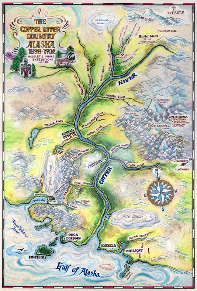 | The Copper Rive Country. Hazelet-Meals Expedition. Copyright J.H. Clark, 2012. Illustration by Mary Dennis Kannapell. |