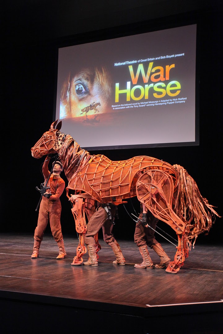 Last month subscribers to PNC Broadway in Louisville were invited to a special presentation at the Bomhard Theater. About five hundred people turned out that evening to meet Joey, the star of the Broadway sensation War Horse. Joey, in case you are not yet familiar with the characters in Michael Morpurgo’s novel, is a horse. Not a human character in the form of a horse – a real, live, breathing horse. Steven Spielburg’s screen adaptation features an actual member of the species Equus ferus caballus. The creative team behind the stage version, however, had to be a little more creative. Directors Marianne Elliott and Tom Morris worked with South African puppet designers Basil Jones and Adrian Kohler of Handspring Puppet Company to create Joey, Topthorn and the other puppets that star in the Tony Award-winning production of War Horse. But wonderful puppets and an engaging story still were not enough. The team turned to choreographer Toby Sedgwick to develop the movements that would allow audiences to willingly suspend their disbelief and accept Joey as a living member of the cast. Sedgwick drew heavily from the traditional Japanese puppet form bunraku and Thai puppet theatre to train the three-person teams responsible for actualizing the characters of Joey and Topthorn. Following their presentation, I sat down with the team that includes puppeteer/actors Jude Sandy, Isaac Woofter and Lute Breuer to lift the veil a bit on the techniques they use to give Joey life. They began by telling me about the physical and emotional tasks assigned to each member of a given team.